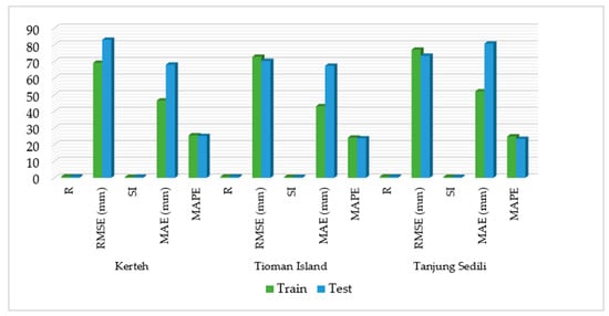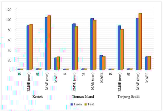 Figure 8 shows that the RMSE at the Tioman Island was 90.46 and 84.88 mm during the training and testing periods, respectively, whereas that at Tanjung Sedili was 86.52 and 79.32 mm during the training and testing periods, respectively.