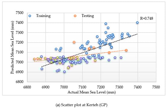 In accordance with Figure 6, the PUK was optimal with R of 0.815 and 0.825 for training and testing, respectively, at Tanjung Sedili. The optimal PUK model was clearly the one showing minimum RMSE values of 77.1 and 73.43 mm during the training and testing periods, respectively (Figure 6).