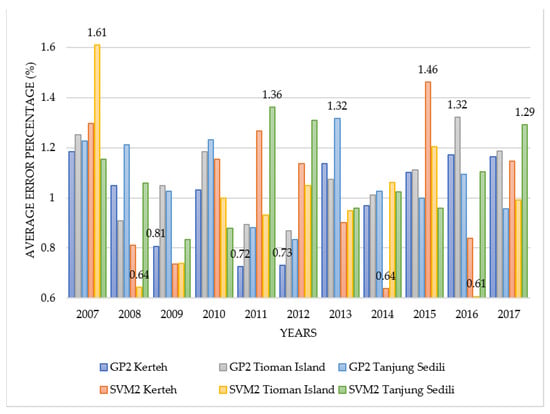 The highest average percentage error for SVM2 was 1.61% in 2007 and occurred at the Tioman Island. However, the highest average percentage error for GP2 was 1.32% in 2013 and 2016, which could be observed at Tanjung Sedili and the Tioman Island, respectively. The average error percentages of both the models were not higher than 5%.