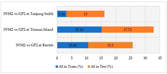 The comparison of SVM2 and GP2 with the most optimal kernel functions was evaluated using the AI equation (Figure 8).