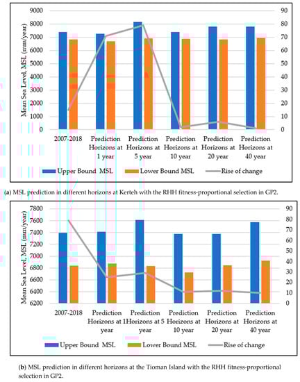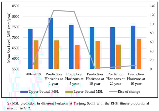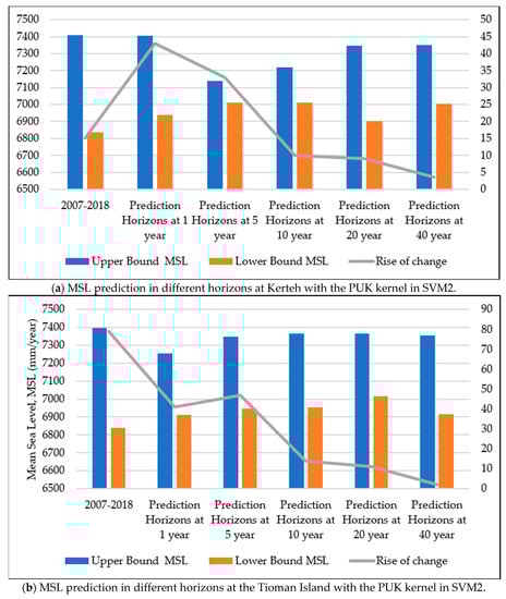 This study aimed to examine the capability of the SVM and GP models in different prediction horizons of 1, 5, 10, 20, and 40 years for MMSL forecasting of the sea level in Kerteh, the Tioman Island, and Tanjung Sedili at the EPCM. The results of the study using the SVM in various kernel functions (i.e., NP, RBF, and PUK) and in the GP-based model, namely the ramped half–half (RHH) model with fitness-proportional selection and rank selection, were obtained for comparing the capabilities of the two models.