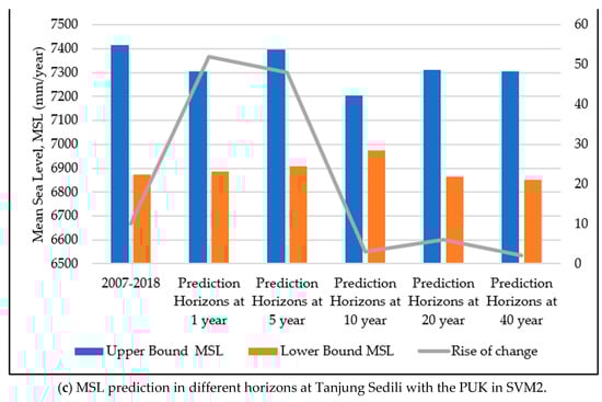 In accordance with Figure 11, the predicted MSL from five different prediction horizons with an SVM2 input design at the study locations are presented with the upper and lower bounds of the predicted MSL. Figure 11 depicts that the highest predicted MSL in the upper bound could be observed at a prediction horizon of 5 years at Tanjung Sedili with a value of 7396 mm. The second highest predicted MSL in the upper bound occurred at prediction horizons of 10 and 20 years at the Tioman Island with a value of 7396 mm. The lowest value in the upper bound of the predicted MSL was observed at Kerteh as 7350 mm at a predicted horizon of 40 years. However, the lowest value of the predicted MSL in the lower bound for all the study locations was between 6836 and 6852 mm. The minimum increase in the predicted MSL was 2.0 mm/year, whereas the maximum increase was 79.0 mm/year.