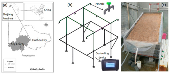 The soil samples were collected from Anji County (30°34′ N, 119°23′ E; Figure 1a) in the northwest Zhejiang Province of China that belongs to the mid-subtropical monsoon region, characterized by abundant rainfall and mild climate. According to the records from the local meteorological station, the annual mean temperature is 15.6 °C, and the number of rainy days is 171, with an annual sunshine duration of 1792 h. The annual average relative humidity is 81%, and the annual mean precipitation is 1414 mm, 24.2% of which occurs from January to March, 61.7% from April to September and 14.1% from October to December. The surface soil layer is severely scoured and coarsened with the sand layer exposed due to heavy water erosion. The soil is typically derived from weathered granite, which is dominant in the region.