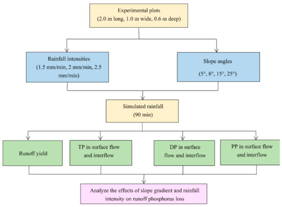 However, the subsurface transport of P during heavy rainfalls is hard to evaluate because of many uncontrollable factors, including rainfall duration [20], vegetation cover [1,27] and soil properties [29]. To overcome these difficulties, artificial rainfall simulations can be applied to control the effects of rainfall intensity and slope angle, and therefore to shorten the experimental time and more easily observe the runoff generation processes [30]. Because of the difficulty in simultaneous monitoring overland flow and interflow under field conditions, this study adopts three-dimensional runoff plots with adjustable slopes to conduct rainfall tests through indoor artificial simulation. This study aims to evaluate the P loss through overland flow and interflow on slopes with different angles and under various rainfall intensities. Studying the mechanisms of P loss can provide scientific support for controlling nutrient loss. It also provides a theoretical basis for the prevention of agricultural NPS pollution and, consequently, sustainability.