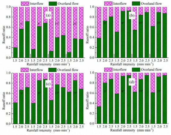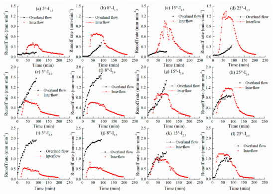 Variations of overland flow and interflow rates with time of runoff on slopes with different angles and under different rainfall intensities.