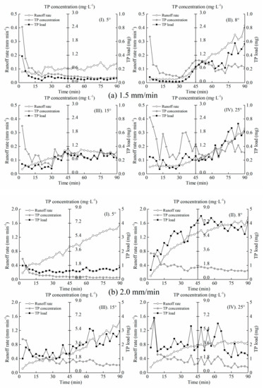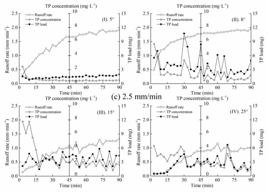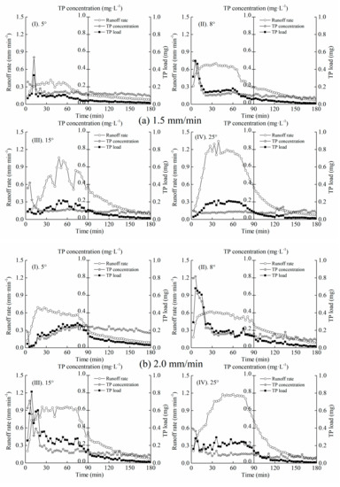 The dynamics of TP loss through overland flow under different experimental conditions is depicted in Figure 4. CTP in overland flow was relatively high at the initial stage and then it declined with time of runoff. The early observed high concentration was similar to the first flush effect that happened during an urban storm event [2] and the reason might be that the rainfall splashes disrupted soil aggregates and entrained particulates once overland flow produced enough shear stress [10,40]. The average CTP in overland flow presented a positive relationship with rainfall intensity and slope angle. CTP increased with rainfall intensity, the maximum value being observed at 2.5 mm/min rainfall and the minimum value at 1.5 mm/min rainfall. Gao et al. [1] also found that heavier rainfalls led to increasing P export, which gradually declined with time of runoff. The reason might be that the applied fertilizers are in a high-risk period of nutrient loss [41]. Most of the P stays in the topsoil of the bare slopes, being easily transported away by heavier rainfalls with a strong scouring effect. The immediate output of P at the beginning of rainfall led to great changes of the initial CTP. Rainfall intensity greatly affects overland flow generation [42]. The dilution effect appeared as overland flow progressively increased with time of runoff. Similar results have been reported in unsaturated loess soils [43]. It was observed that the roughness of the slopes increased with rainfall intensity, as well as slope angle and the occurrence of the phenomenon of rill erosion. Hydraulic erosion results in severe loss of suspended nutrients such as PP through overland flow. Studies have shown that P concentration is affected by the proportion and total amount of organic fertilizers applied [27], as well as the application method [44]. For example, Zhang et al. [25] found that the depth of overland flow and LTP was significantly lessened (p < 0.05) under the impacts of soil surface protection and organic matter addition. Chang et al. [26] also applied three kinds of soil management measures (humic acid (HA), polyacrylamide (PAM), green manure (GM)) to study P losses through plot-scale experiments. They found that P loss from sloping farmland was reduced by different agricultural practices with an order of GM > PAM > HA.