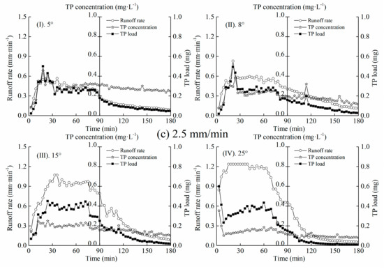 TP loss by overland flow with time of runoff on slopes with different angles and under different rainfall intensities of (a) 1.5 mm/min, (b) 2.0 mm/min and (c) 2.5 mm/min.
