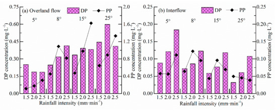 The trends of average CDP and CPP in overland flow and interflow in different experimental conditions are depicted in Figure 6. The average CDP in overland flow fluctuated with rainfall intensity on slopes with different angles, which is consistent with the findings of Wu et al. [28], who studied the loss of adsorbed and dissolved P on bare loess slopes. The maximum average CDP in overland flow (0.598 mg/L) was 3.21 times higher than the minimum value. Average CDP in interflow regularly increased with rainfall intensity and declined with slope angle. The maximum average CDP in interflow (0.184 mg/L) was 5.75 times higher than the minimum value. The reason might be that CDP in interflow is dominantly dependent on runoff generation. Runoff volume increased with slope angle and produced a dilution effect on CDP. The average CDP declined under heavier rainfalls until the desorption equilibrium of soil P was reached. The interflow volume declined with increasing rainfall intensity due to the formation of soil crusts caused by heavy rainfall splashes and the reduction of the infiltration rate. Both the DP load (LDP) and average CDP in interflow were comparatively smaller than that in overland flow, which indicated that overland flow was the predominant loss pathway of DP. The results are in accordance with that of Heathwaite and Dils [16], who found that DP dominates P loss via overland flow. They attributed the DP increase to the soil-interflow interactions. A water sealing layer will be formed as runoff depth increases to a certain extent. Especially under heavy raindrops and splash erosion on gentle slopes, soil seals were more likely to form and impact DP dissolution in the topsoil. The reason might be that the splash erosion was mild and the desorption capacity of soil P was weak at light rainfalls. Rainfall splashes and runoff generation strengthened with increasing rainfall intensity and intensify the fluctuations of CDP. Consequently, the average CDP in overland flow declined with increasing rainfall intensity. This was because overland strengthens under heavier rainfalls and thus intensifies soil erosion which was greater than the dilution effect. Interflow increased faster than the dissolution rate of soluble P. Dupas et al. [17] found that CDP in shallow ground water was a good indicator for stream P concentration. They recommended the predominant CDP regulation for controlling stream nutrient discharges.