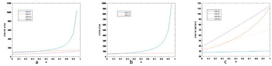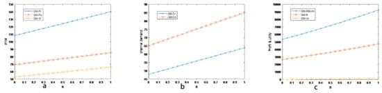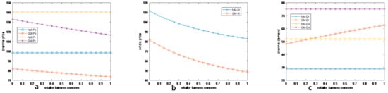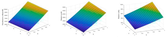 Figure 8a–c reflects the impact of the green sensitivity of traditional retail and direct online channels on the profit and utility of supply chain members. As can be seen from a and b, the green degree sensitivity of traditional retail and direct online channels has a positive effect on the profit and utility of the manufacturer and the retailer’s profit. Observing c, as improves, the retailer’s utility presents a decreasing trend. This is because when the retailer has increased fairness concerns, the manufacturer gains more profit through direct online channels, and the retailer feels unfairly treated and their utility decreases.
