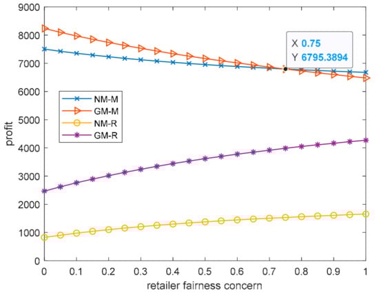 As shown in Figure 3, regardless of whether the manufacturer adopts green manufacturing or not, the profit of the manufacturer maintains a declining trend with the improvement of the retailer’s fairness concern level, whereas the opposite outcome is achieved for the retailer. The higher the level of fairness concerns, the higher the retailer’s profit will be. When the manufacturer adopts green manufacturing, the retailer’s profit is always higher than when the manufacturer does not adopt green manufacturing, In addition, we found that when the retailer has a sufficiently high fairness level (namely ), the manufacturer will not adopt green manufacturing because the manufacturer’s profit is lower.