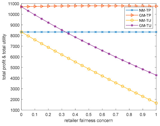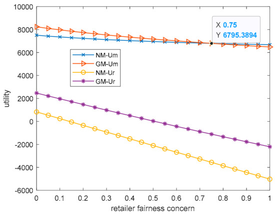 As can be observed in Figure 4, the impacts of retailer’s fairness concerns is the same because the utility of the manufacturer is equal to the profit of the manufacturer. Thus, the manufacturer’s strategy choice is consistent with the above analysis. In addition, regardless of whether the manufacturer adopts a green manufacturing strategy or not, the retailer’s utility decreases with the improvement of the fairness concerns level. At the same time, under green manufacturing, a retailer’s utility is higher than without green manufacturing. The retailer will benefit from the green manufacturing strategy, and the retailer will choose low fairness concerns to ensure relatively high utility.