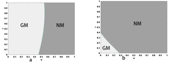 Figure 11 reflects that when the retailer has fairness concerns, and have an impact on the adoption choice of green manufacturing under a dual-channel system. Figure 11a shows the manufacturer’s strategy preferences, and Figure 11b shows the retailer’s strategy preferences. It can be seen that when the channel price crossover coefficient is increased—that is, the competition between channels is intensified—both the manufacturer and retailer tend toward the traditional dual channel model. When is small ( is approximately less than 0.45), the manufacturer will tend to adopt green manufacturing; while and are small ( is approximately less than 0.3 and is approximately less than 0.4), the retailer prefers the manufacturer to adopt green manufacturing. This reflects the fact that when the retailer has fairness concerns, it is not always beneficial for supply chain members to adopt green manufacturing under a dual-channel supply chain. Therefore, whether the manufacturer adopts green manufacturing should be based on the retailer’s fairness concerns, the product’s green degree, government subsidies, channel competition and market share.