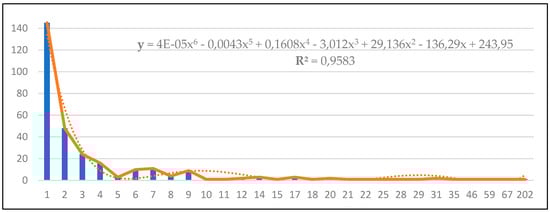 In this sense, the normality of the frequencies was first studied through the Kolmogorov–Smirnov (K–S) test, with a significance level α = 0.05. In this way, if the p-value obtained for the categories was higher than the significance level, the normality of the distribution would be accepted. Subsequently, the function of the density and the definite integral (Equation (2)) was undertaken with the study of the goodness-of-fit applied through the coefficient of determination R2 to represent the behavior of the linguistic expressions and test the forecast model of each word set.