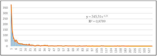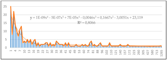 Therefore, from the density function, by integrating the lower limits of 1 and upper limit equal to the frequency value of the word, the space in which each word would be located according to the horizon of market expansion could be determined later. The purpose for which, through Chebyshev’s Theorem (Equation (3)) to find the probability of occurrence of an event for any random variable X as a function of k standard deviations concerning the arithmetic mean μ, is detailed in [84].