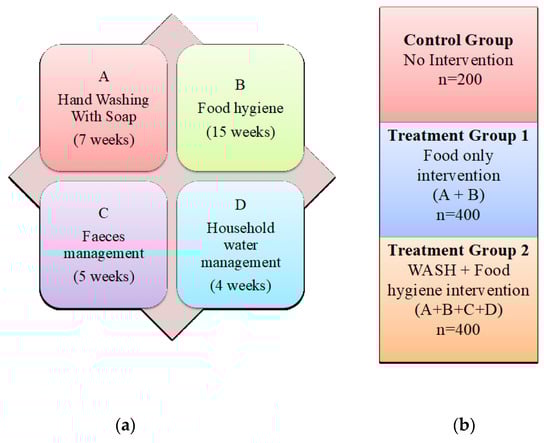- Islam, M.S.; Mahmud, Z.H.; Gope, P.S.; Zaman, R.U.; Hossain, Z.; Islam, M.S.; Mondal, D.; Sharker, M.A.; Islam, K.; Jahan, H.; et al. Hygiene intervention reduces contamination of weaning food in Bangladesh. Trop. Med. Int. Health 2013, 18, 250–258. [Google Scholar] [CrossRef] [PubMed]
