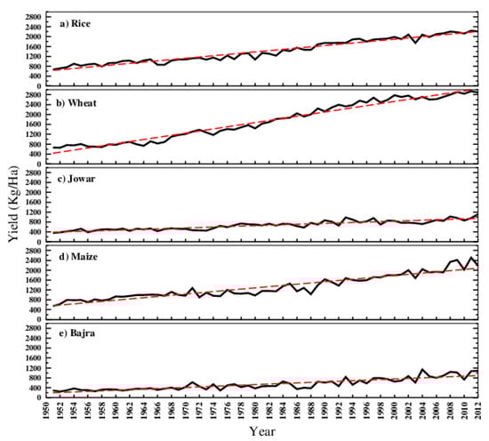 Crop yields are sensitive to climate variations (e.g., [1,2,3]. It is undisputed truth that the climate change shows impact on the crop yields [4]. An increase of 1 to 2 °C temperature during the crop growing period causes crop dehydration and greatly reduces the grain production in regions such as the North China Plain, Indo-Gangetic Plains and the corn belt of the United States [5]. The year-to-year variations in crop yields show changes in crop products and food demands in the context of increased population. It is inferred that the global crop production (maize, rice, wheat, and soybean) must be doubled by 2050 to meet the raising population’s food demand globally [6]. It is reported that the crop yields/production of India are well correlated with the Indian monsoon rainfall [7,8] and are linked to the global teleconnections such as El Niño [9,10]. Adejuwon [11], studied the food crop production in Nigeria in relation to the climate variability and reported that the monthly rainfall changes have an impact on food production. Also, he reported that the changes in the yield can be seen as the rainfall and moisture supply approaches the critical minimum value. The impact of rainfall variations on rice production is studied by Asada and Matsumoto [12], and concluded that the relation of rainfall and rice production differs by region over the Ganges—Brahmaputra Basin. A study on response of evapotranspiraton to the drought over India observed that the rice yields have shown interannual variability associated by rainfall and evapotranspiration changes [10]. The regional results of the study of climate change effects on the crop production in US favors northern areas and can degrade the conditions in southern areas of the US [13].