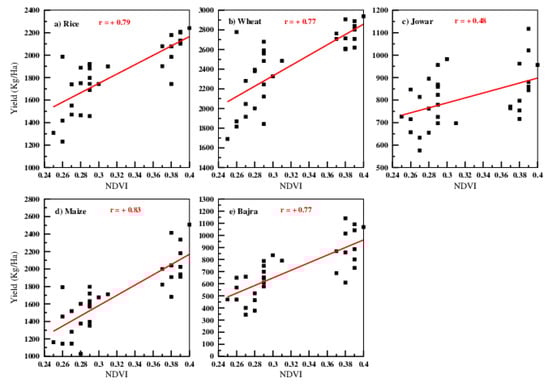 The corresponding standard deviations of these crops are 384, 289, 383, 124 and 217 which indicate the interannual variability in wheat and maize yields are very high during the study period. The authors also examined the variations of these crop yields with the satellite vegetation index, known as Normalized Difference Vegetation Index (NDVI) for all India scale. It is well documented that NDVI is a best indicator of ground vegetal cover and can be used to study the crop growth, production and yields [21,27,28]. Here, the authors have compared the crop yields data with NDVI for the period 1982 to 2012. The NDVI data for the period 1982 to 2000 has been collected from NOAA AVHRR and for the period 2001 to 2012, it is taken from MODIS TERRA over India. The NDVI monthly data has been averaged for all the grids of Indian land mass and is taken as the representative of All India NDVI. Then the data is clubbed for the period 1982 to 2012 and the correlations were obtained. It is to be noted that corrections such as water vapor and aerosol approximations are different for both the data sets of AVHRR and NDVI. Also, the frequencies used to obtain NDVI are also different. The correlations of NDVI and the crop yields revealed the linear relation with statistically significant value. The correlation values for rice, wheat, jowar, maize and bajra yields with all India NDVI are 0.79, 0.77, 0.48, 0.83, 0.77 with varied significance from 0.05 to 0.01 levels, respectively. Since NDVI is over all status of vegetation including forest cover, the correlation may not completely explain the variations in crop yields but can reflect the overall crop health. The scatter plots of NDVI and the five major crop yields are given as Figure 2a–e.