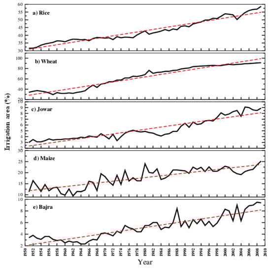 Percentage area covered by irrigation for (a) rice (b) wheat, (c) jowar, (d) maize and (e) bajra crops over India during the period 1951 to 2009.
