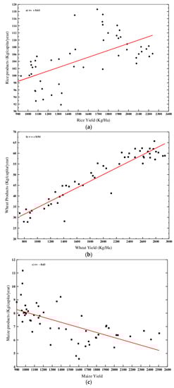 Scatter plots of (a) Rice products and rice yield; (b) wheat products and wheat yield; (c) maize products and maize yield of India.