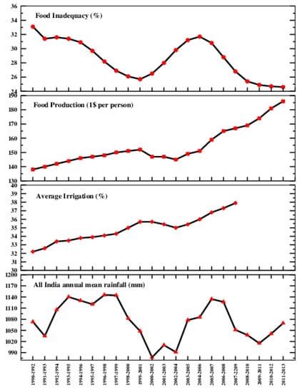 3 Year averaged data of: food inadequacy (%), food production ($1 per person), average irrigation of five major crops and average annual rainfall over India.
