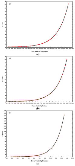 The basis for this analysis is mainly from Ray et al. [2], where they have reported that the present global yield trends are insufficient to double the crop production by 2050 to meet the increasing population food demands. They have reported that the yields of maize, rice, wheat and soybean are presently increasing with a percentage of 1.6%, 1.0%, 0.9% and 1.3% per year which is far less than the required rate of 2.4%. They also found that the crop production would increase by 67%, 42%, 38% and 55%, respectively, again very less than needed. Hence in the present analysis, the authors attempted to see the crop yields of rice, wheat, maize, jowar and bajra by the year 2050 to understand that whether the present yields are increasing at the required rate or not. For this, we have applied Gumbell Extreme Value Analysis to estimate the crop yields till the year 2050. The data of yields has been considered till the year 2012 which is available with us and extended the yields by increasing an amount of 50 kg ha−1 for every crop from the yield value recorded in the year 2012. For every increment of 50 kg ha−1 yields, threshold years have been estimated to understand how many years will the yield take time to reach the required value. For estimating the T-years, we have used Gumbell Extreme Value theory for which the inputs of scale and shape parameters are obtained from the Maximum Likelihood Method (MLM). In the present work, we have taken average yield of every crop for the years 1951 to 2012 and considered the double of that average as the reference value to meet the projected food demand by the year 2050. The average values of crop yields for rice, wheat, maize, jowar and bajra are 1420 kg ha−1, 1717 kg ha−1, 1321 kg ha−1, 666 kg ha−1 and 543 kg ha−1 respectively and the double of these values are set as 2840 kg ha−1, 3434 kg ha−1, 2642 kg ha−1, 1332 kg ha−1 and 1086 kg ha−1 respectively. The scale and shape parameters of the above crop yields obtained from MLM are 1234,386; 1396,660; 1143,350; 596,148 and 451,172 respectively. From our analysis, we found that the crops such as wheat and bajra will have sufficient yields by the year 2050. The wheat yield will become double within 21 years and similarly bajra yield will be doubled within 40 years right from the year 2012. This is a positive signature revealed from the extreme value analysis. Our analysis shows that the remaining crops; rice, maize and jowar are in trouble which cannot reach the double value by the year 2050. Figure 6a–c depict the plots of crop yields and T-years for the crops rice, maize and jowar, respectively. Please note that for every yield value of the data available with us, we have estimated the T-year and after the year 2012, we have extended the yield value as mentioned earlier by 50 kg ha−1. The main assumption here is that we have considered the yields will increase every year though the time series of yields show distinguished variations with increase and decreased values. From Figure 6a–c, we can see that all the yields increased exponentially with the increase in the number of years. The minimum value of crop yield takes about one year to exceed and it has gone to 80 years to exceed the double of the averaged crop yields. A value of 2400 kg ha−1 rice yield will take about 21 years, 2500 kg ha−1 takes about 27 years and it can reach only 2650 kg ha−1 in 39 years which means by the year 2050. This is a deficit of −200 kg ha−1 that has to be attained by the 2050 i.e., about 2840 kg ha−1 (double of average rice yield). It is found from the Figure 6a that an yield of 2840 kg ha−1 will take about 66 years i.e., probably by the year 2080. It is also estimated that the present rate of increment is 12% and the required increment is about 20%. Hence an additional effort is required for 8% more increase than to the present. This percentage increment has been calculated by taking the difference of 2050 value and 2012 value and dividing with the number of years i.e., 38 years. Figure 6b gives the T-years for different maize yields. It is also found that the double value of maize yield can be exceeded/obtained for a period of 75 years which is also not meeting the required criteria. For a value of 2500 kg ha−1 of maize yield, it is estimated that 48 years will be taken and for 2600 kg/ha, 65 years will be taken. Similar case is found with jowar yield also as it takes 163 years to double of its yield. By the year 2050, it can exceed only 1150 kg ha−1 which is very far from the required. The overall analysis shows that the crops such as rice, maize and jowar cannot be doubled by the year 2050 unless some additional efforts such as increasing the cultivated land and by including the new techniques for getting more yields.