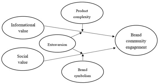 We utilize the use and gratification theory to explore this research question. The use and gratification theory maintains that consumers’ media use is motivated by the gratification from media use. Based on this idea, we argue that product, brand and consumer characteristics may affect community engagement because they could influence consumers’ gratification and consumers attach unequal importance to various dimensions of gratification in terms of different products and brands when engaging with the brand community [24]. Drawing from the framework of Wirtz et al. [21] and Kaur et al. [22], we examine three important product, brand, and consumer characteristics, i.e., product complexity, brand symbolism, and extraversion. The authors collected 462 questionnaires from a wide range of brand communities to test hypotheses. The results indicate that informational value and social value are positively associated with brand community engagement. Meanwhile, product complexity positively moderates the relationship between information value and brand community engagement while brand symbolism positively moderates the relationship between social value and brand community engagement. Extraversion strengthens the effect of social value and brand community engagement but a similar moderation effect does not exist in the relationship between informational value and brand community engagement. To the best of our knowledge, this is the first empirical study to investigate the impacts of product, brand and consumer characteristics on consumers’ community engagement. It advances our understanding of the drivers of brand community engagement [16,22,25,26].
