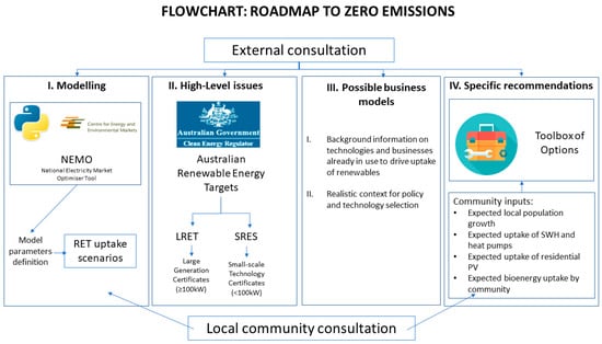 The process of producing the report [] was just as important as the outcomes of the report itself. This process included a series of consultations with the broader community as well as with Noosa Shire Council. This not only provided valuable feedback regarding the interest of the Noosa community and council in different strategies to increase the uptake of renewable energy, but also provided feedback on modeling assumptions, and importantly, made the activities of Zero Emissions Noosa very visible to the community. The report, entitled Achieving 100% Renewable Electricity in Noosa, is an electricity transition plan that consists of four components that have different functions and impacts on community engagement, motivation, and guidance. These are: (i) Modeling, (ii) high-level issues, (iii) possible business models and (iv) specific recommendations (referred to as a toolbox of options). A flowchart illustrating the processes used by ITP to develop an energy transition plan for Zero Emissions Noosa is found in Figure 1.