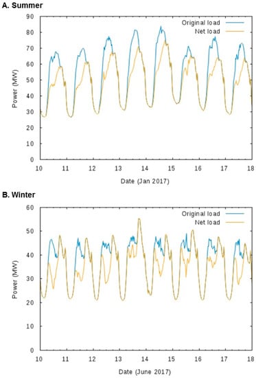 The electricity generation from distributed PV in Noosa shire was calculated using the average hourly generation of typical rooftop PV systems within Noosa LGA (PV data was sourced from publicly available PV performance database provided by PVOutput.org). The hourly generation over a year was then estimated by scaling the number and the size of PV systems in Noosa LGA (Derived from APVI Solar Map []). The same scaling method was used to estimate the hourly generation from future installations of behind-the-meter PV for each scenario (e.g., Base case and Stretch as discussed below). The estimated generation from PV systems was 41,300 MWh and so the real underlying use of electricity in Noosa was 353,964 MWh. The load as seen by the zone substations (Net load, orange) and what the load would have been if it had not been for the existing PV systems (Load, blue) as seen by the zone substations during the peak weeks in summer and winter are given in Figure 2. The highest peaks in summer occur due to the combination of higher visitor numbers and air conditioning load and are reduced by PV generation. During the winter evenings, small spikes are visible due to the activation of off-peak water heating.