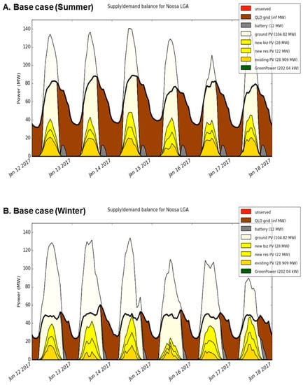 RE technology mix for Noosa—Base case ((A) summer, (B) winter) [].