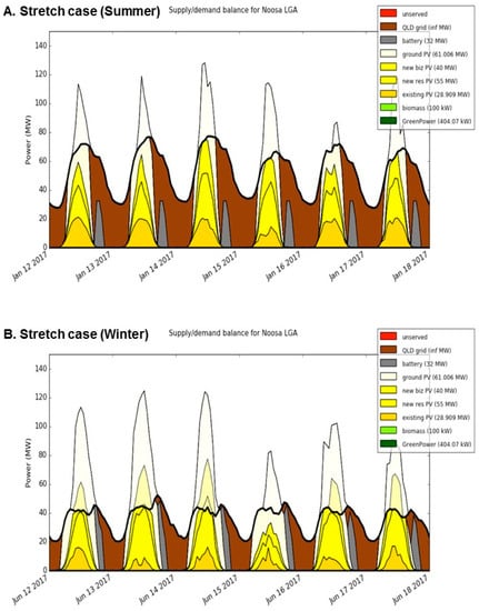 RE technology mix for Noosa—Stretch case ((A) summer, (B) winter) [].