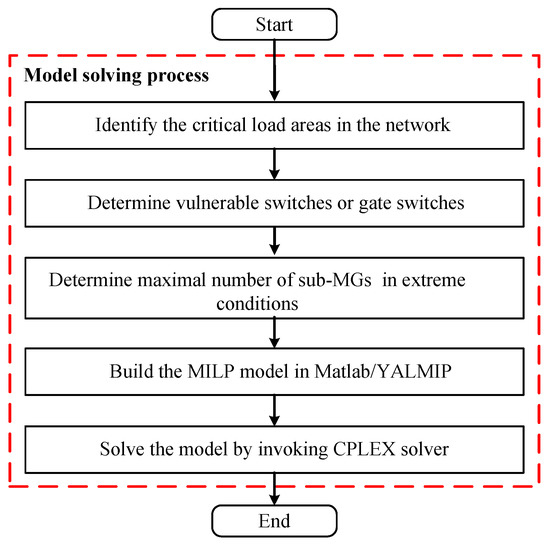 Firstly, identify the critical load areas in the network. After that, determine the vulnerable switches or gate switches in the microgrid. If the vulnerable switches or gate switches passively or actively break due to external disturbances, it may lead to the formation of sub-MGs. Subsequently, determine the maximal number of sub-MGs which depends on local conditions. If the local area is in a good condition, the maximal number of sub-MGs can be set to 1 as an autonomous microgrid. However, if the local area easily suffers from extreme conditions such as hurricanes, the maximal number of sub-MGs can be more. Since then, the parameters are determined. Finally, the MILP model is built in Matlab/Yalmip and solved by invoking CPLEX solver.
