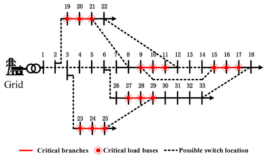 Since there are critical loads in the network, the switch of branches connected to those loads should be closed in the sub-microgrids. In addition, some branches are always closed. Except those branches, the other branches’ switches may divide the whole microgrid into several sub-microgrids. Therefore, the constraints of the switch states of branches can be expressed as: