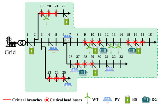 The configuration of the microgrid is given in Figure 2, the critical load buses and branches are identified with red color. The possible switches dividing the microgrid into sub-microgrids are marked with dash lines. The peak load in the microgrid is approximately 3 MW, and the critical load in the microgrid is approximately 1.5 MW. The alternative DERs are composed of 6 DGs, 5 WTs, 6 PVs, and 4 BSs. The DER parameters are given in Table 1 and Table 2. The data used are mainly referred to [32,33,34]. Assuming that the charging and discharging efficiency of the BSs are both 0.9. The BSs are under half charge statue as the initial value. The electricity prices are given in Table 3. Note that the electricity prices are dynamic in reality [35,36,37]. However, since it is not the focus of this paper, a static time of use price is applied for simplicity. Assume the selling price is 0.8 times as many as the buying price. The typical weekday and weekend for each of the four seasons of the year are selected.