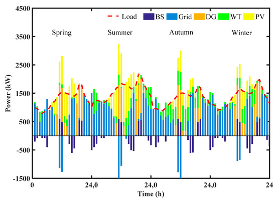 The generation schedule result of DERs in the microgrid with typical days of the year is shown in Figure 4. DGs run to meet the load because of the considerably high load level. Since the generation of WTs and PVs is lowly consumed, WTs and PVs are efficiently used to generate power. The great mass of the power is from the utility grid because of the restricted capacity of DERs. During the day, the BSs utilize the price difference of peak and valley electricity to earn profit. The BSs charge during off-peak1/off-peak2 h and discharge during peak1/peak2 h. It demonstrates the economy of the schedule and verifies the effectiveness of the developed model.