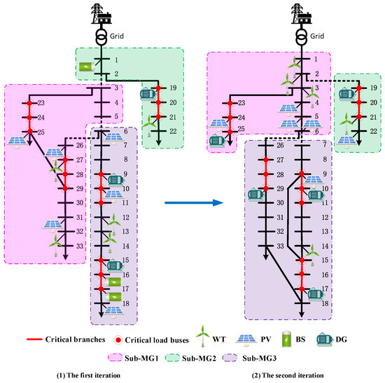 Formation of sub-MGs and placement of DERs in two iterations in Case 3.