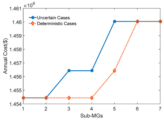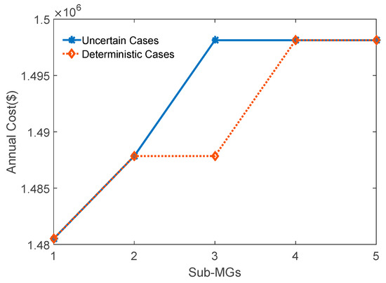 More cases are conducted when the number of sub-MGs (|SM|) increases from 1 to 5. The number and type of DERs are listed in Table 5. From Table 5, with the increase of sub-MGs, the number of DGs increases from 3 to 5, while the number of BSs decreases from 3 to 0. As more sub-MGs are formed, more DGs are needed to maintain the power supply of critical load areas. It also brings an increase in annual cost. The capacity of a DG is twice larger than that of a BS. Increasing one DG is equivalent to reducing one or two BSs from the perspective of power supply. Therefore, the number of BSs decreases with the increase of the number of DGs. Since the generation cost of WTs and PVs is considerably low, all the WTs and PVs are installed in those cases.