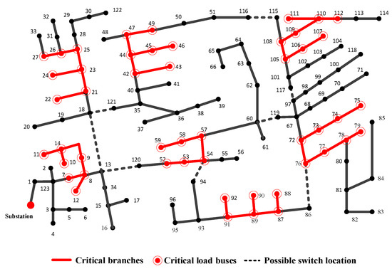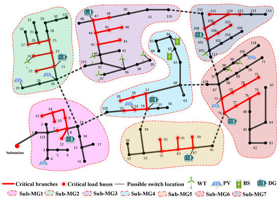 The area of sub-MGs is not predetermined in this case. The procedure ends after two iterations. The optimization always identifies the worst formation of sub-MGs. This is easy to be observed in Figure 6. The area of sub-MGs and switch locations that divide the network into sub-MGs are completely different from those in Case 2. Similar to Case 2, DGs are mostly placed around the critical load area. Therefore, critical loads can always be supplied. Note that the annual cost in Case 3 is more than that in Case 2, and the placement of DERs in the microgrid is different. However, the placement of DERs in Case 3 is more robust than that in Case 2. It is because it can supply critical loads under the worst formation of sub-MGs.