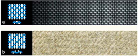 As reinforcement, we tested two types of fabric to obtain two composites for different fields of application. The first one (Figure 5a) was C-200/T, a plain-woven carbon fiber fabric with a thickness of 290 ± 44 μm and a weight of 190 g/m2, supplied by Prochima, while the second (Figure 5b) was Biotex Flax 400 g/m2 2 × 2 Twill, a flax fiber fabric with twill weave, a thickness of 450–800 μm, and a weight of 400 g/m2, supplied by Composite Evolution.
