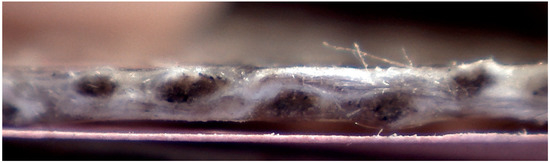 The sample was cut, and its section was observed under an electron microscope. The visual analysis of the section made it possible to verify whether the interpenetration between matrix and reinforcement was complete (Figure 6).