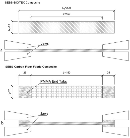 This test was an extensional test on a strip of the composite with a reinforcement warp oriented parallel to the axis of the specimen. It was carried out following the directives of the UNI EN ISO 527-4 standards. It prescribes the use of rectangular specimens of type 2 (without end tabs) or 3 (with end tabs) for composites reinforced with multidirectional continuous fibers, referring to the requirements of UNI EN ISO 527-1, point 5.1, for the choice. The specimens in SEBS–Biotex were made according to the indications of type 2, with L3 = 200 mm, L = 150 mm, and b1 = 25 mm (Figure 7a). Type 2 was satisfactory for the success of the test. Conversely, with the SEBS–Carbon specimens, even though they were made with the same geometry, tests were unsuccessful due to slipping. In such cases, UNI EN ISO 527-1, point 5.1, prescribes the use of type 3, rectangular but with ends tabs (Figure 7b). Therefore, it was decided to make PMMA (polymethylmethacrylate) beads glued to the composite. Different glues were tested, with the final choice falling on ethyl cyanoacrylate, which guaranteed the adhesion of the heel from the composite during tests.