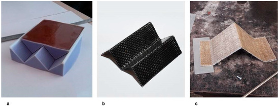 The two parts of the mold were placed in the press with the composite interposed. The temperature was set at 140 °C and the mold was not put under pressure, but only left in simple contact for 10 s. The composite reached the desired configuration, thus acquiring the possibility of kinematic movement and, at the same time, good resistance due to its shape (Figure 10). The angle between the faces of the mold used for this test was 90°.