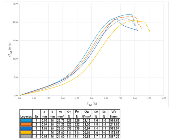 The uniaxial tensile tests of the SEBS–Biotex composite showed stress–strain diagrams (Figure 12) with average tensile strength values FM = 521 N, maximum stress σM = 21.20 N/mm2, with standard deviation s = 0.63 N/mm2 and coefficient of variation ν = 2.96. The deformation εM had, in percentage, a mean value equal to 7.5%, with standard deviation s = 0.5% and coefficient of variation ν = 6.71.
