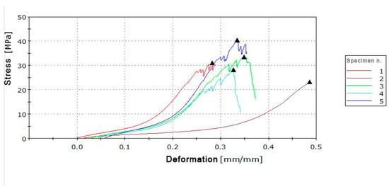 The uniaxial tensile tests on SEBS–Carbon fiber fabric samples showed stress–strain diagrams (Figure 11) with average tensile strength values of FM = 1720 N, maximum stress σM = 104.73 N/mm2, with standard deviation s = 9.81 N/mm2, and coefficient of variation ν = 9.36. The mean deformation was εM = 2.9%, with standard deviation s = 0.2% and coefficient of variation ν = 7.27.