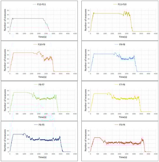 Moreover, the number of evacuees on each flight of stairs varied with time in different patterns. We define as a set of stairs between two adjacent floors, the , and the floor. Using the evacuation of staircase 2 with stair speed 0.224 as an example, in Figure 9, the number of evacuees on each flight of stairs with respect to time is illustrated. Usually, people running from the upper floors will wait if the stairs are filled by evacuees from lower floors. Therefore, the higher the floor is, the longer the waiting time will be. This phenomenon can be represented by the horizontal lines in Figure 9. At the same time, there is an interesting phenomenon: Although the total evacuation time of pedestrians in the high level is longer, the time of the last pedestrian on each floor entering the staircase area is almost simultaneous. That is to say, reducing the time of pedestrians in the staircase area can improve the evacuation efficiency.