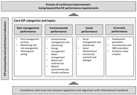 The International EIP Framework describes the performance requirements for EIPs grounded in four key categories: park management performance, environmental performance, social performance and economic performance. The framework provides the basis for defining and setting prerequisites and performance requirements for EIPs, based on 51 criteria (benchmarks). These criteria are inclusive in scope and are aimed at all types of industrial parks (e.g., Special Economic Zones, Industrial Estates, and Manufacturing Zones) in different contexts. The criteria relate to stakeholders in the private and public sectors (e.g., park management, tenant companies, local/regional/national government agencies) wherever these industrial parks are located. While adherence to all of these criteria is recommended, it is understood that some countries may wish to adjust the criteria to their local specificities. Compliance with national and local regulations is a requirement for all industrial parks, regardless of their specific geographic location and characteristics. The focus of the framework is to encourage industrial parks to exceed compliance with local and national regulations with respect to environmental and social issues.
