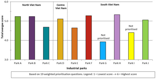 The total scores from the prioritization of the pre-selected industrial parks are presented in Figure 3. The y-axis in the figure is the average score of the 19 weighted prioritization criteria. Each of the prioritization criteria were rated from 1 (totally incorrect) to 6 (totally true) (see Step 3 in Section 4.2.3). Parks are grouped according to their geographical location (North, Centre and South Viet Nam), as the intention is to take into account the geographical balance for the GEIPP. In Figure 3, a higher score means that the park has greater potential to transform into an EIP and the park embeds more favorable features for the successful implementation of the GEIPP.