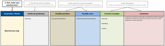 The worksheet “Search by-product” (template provided in Figure 5) is used to identify industrial symbiosis opportunities based on the selection of a specific by-product or waste. The user only needs to make the search selection under “By-product/waste”, based on which other cells are populated automatically. For example, the worksheet can inform the user of which industry can be interested in utilizing the by-product gypsum. The worksheet also informs the user if similar by-product exchanges have already been implemented elsewhere in the world.