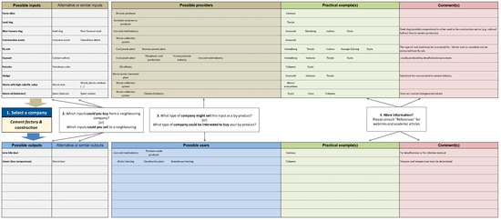 The worksheet “Search by company” (template provided in Figure 6) is used to identify potential industrial symbiosis options based on the selection of a specific company type. The user only needs to make the search selection under “Select a company”, based on which other cells are populated automatically. Based on the selection, the worksheet generates a list of inputs and outputs related to a specific company type, as well as a list of industries with a potential interest in creating industrial symbiosis. For example, the worksheet can inform the user about alternative raw materials and potential reuses of the by-products/wastes of a cement plant.