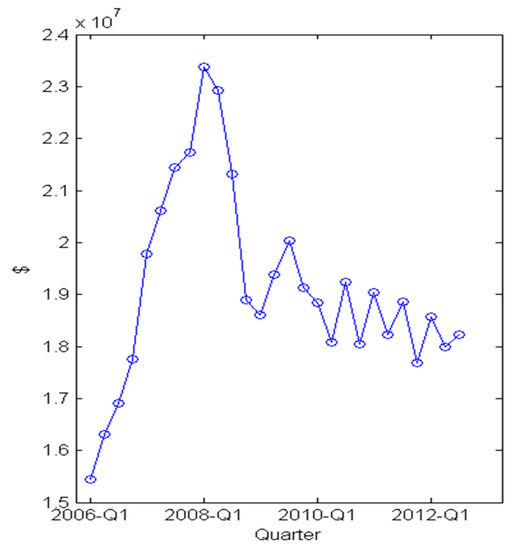 The BIS consolidated banking statistics were used in this study. This paper focused on the foreign claims, which are defined as the sum of cross-border claims plus foreign offices’ local claims in all currencies [16]. The sample period of foreign claims was from the first quarter of 2006 to the third quarter of 2012. Of the reporting countries, 20 countries were chosen because of data availability (According to the BIS consolidated banking statistics, there was only one break reported during the sample period (2006–2012). The United States increased its reporting population in the first quarter of 2009). Figure 1 depicts the trends of the foreign claims of the 20 countries. Figure 1 reveals that the subnetwork of the 20 reporting countries has stagnated more severely than has the whole network. However, Figure 1 does not provide information about whether there are changes in the structures of global financial linkages. Therefore, to answer the question, it may be beneficial to examine the network properties of the linkages.