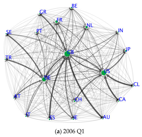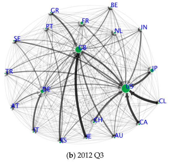 Figure 3 depicts the networks associated with the stochastic matrices, which are constructed from the foreign claims of 20 countries. Accordingly, the figures provide snapshots of the global financial networks in 2006 Q1 and 2012 Q3 from the perspective of a network entropy approach. The width of each edge in the networks is proportional to the components of the stochastic matrices, and the size of each node is determined by the invariant distributions of the stochastic matrices. Compared with Figure 2, Figure 3 reveals the crucial roles played by leading countries in incorporating the heterogeneity of nodes in terms of eigenvector centrality. Other countries lend disproportionately large amounts of money to leading countries. Also, Figure 3 uncovers a notable shrinkage in Germany’s weight and a sizable increase in the weight of the US in the global financial networks.